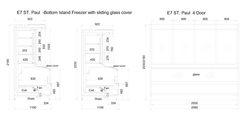| Comprimento | Porta | Altura | Borda frontal | Tampa de arca tipo ilha | Número e modelo | Área de exibição, m 2 | Capacidade dm 3 |
